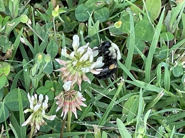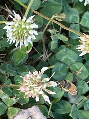 White Clover Trifolium repens is also known as Dutch White, New Zealand White, and Ladino. It is an excellent cover crop, replenishes the soil, and provides critical food to pollinators, including the Brown-Belted Bumblebee and the Western Honey Bee who were guests on our farm last week.